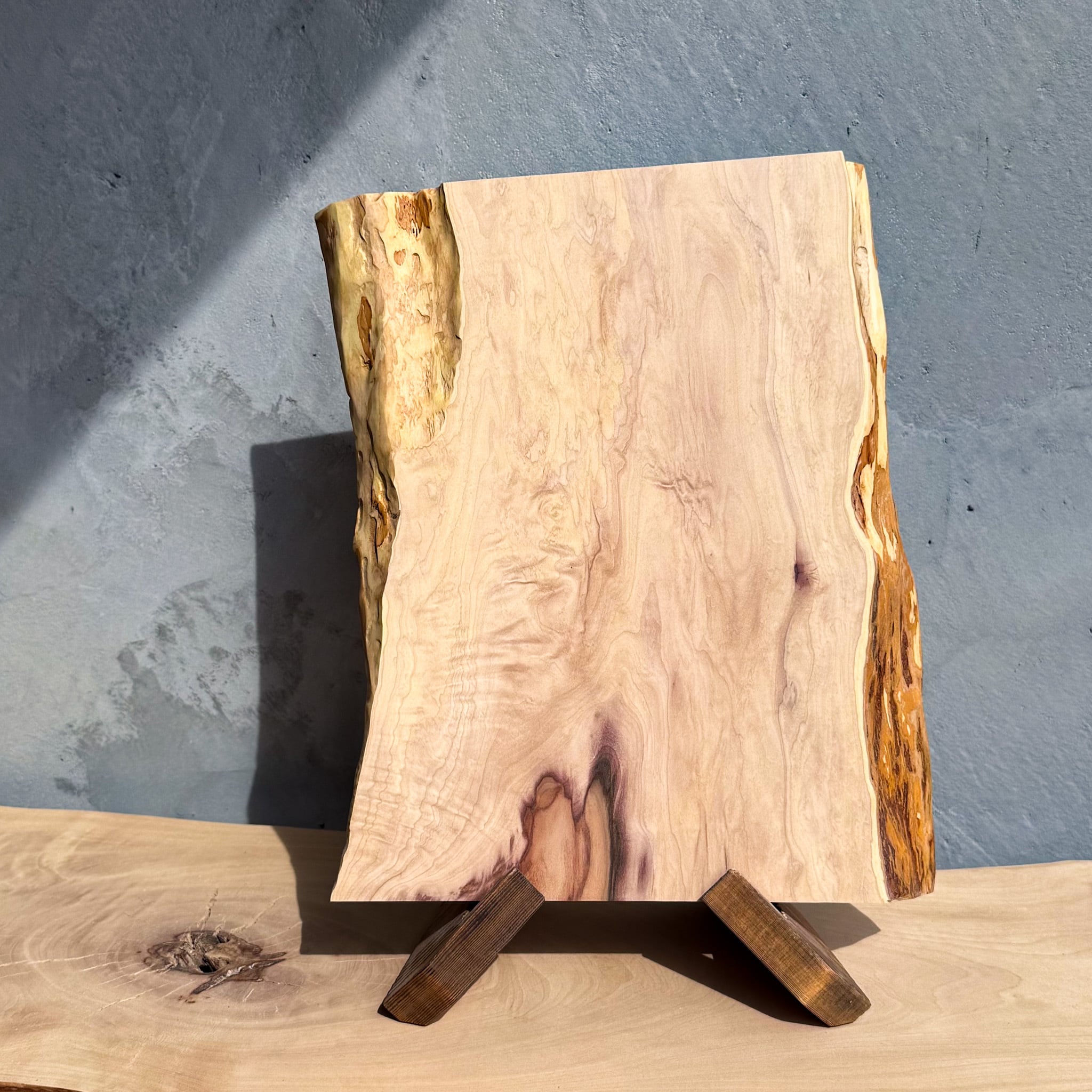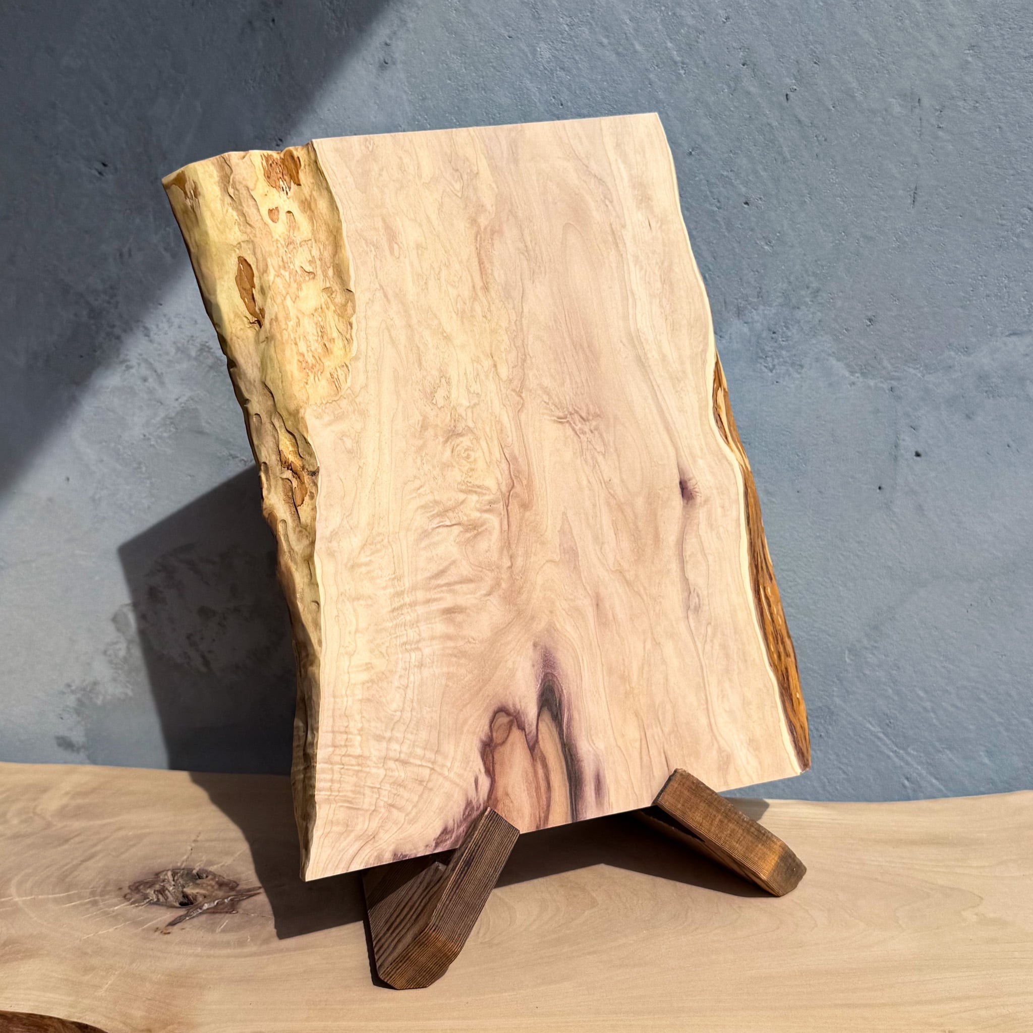本材は辺材の白に心材の紫がビビッと差し、さらに縮杢のユラユラも感じる非常に美しい素材です。